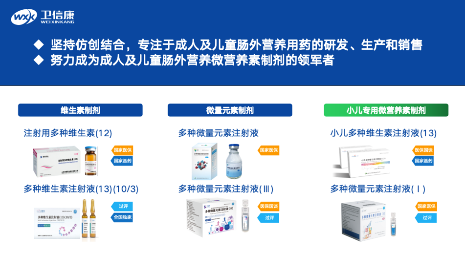 多年來,衛(wèi)信康深耕腸外營(yíng)養(yǎng)微營(yíng)養(yǎng)素制劑的研、產(chǎn)、銷一體化運(yùn)營(yíng),產(chǎn)品管線覆蓋了成人和兒童領(lǐng)域的多種維生素、微量元素等制劑品種,目前已成為該細(xì)分領(lǐng)域的國內(nèi)優(yōu)勢(shì)企業(yè)。已研發(fā)上市的核心產(chǎn)品涵蓋:注射用多種維生素(12)、多種維生素(13)(10/3)水針/粉針、多種微量元素注射液、小兒多種維生素注射液(13)、復(fù)方電解質(zhì)注射液(V)等。