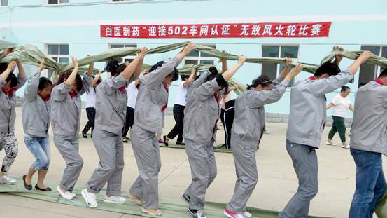 7月1日下午,用編織袋縫制而成的“風火輪”正式亮相白醫(yī)制藥,所有員工聚集在活動區(qū)域,準備參加“迎接502認證”拓展活動無敵風火輪比賽。