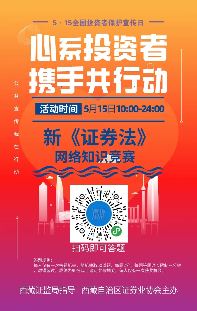 在5.15全國投資者保護宣傳日來臨之時,我們迎來了西藏轄區(qū)首次網絡知識競賽活動,今天同時發(fā)布兩個版本的競賽題,由于兩個版本程序設置了不同的答題規(guī)則和抽獎規(guī)則,敬請您在答題前認真閱讀: