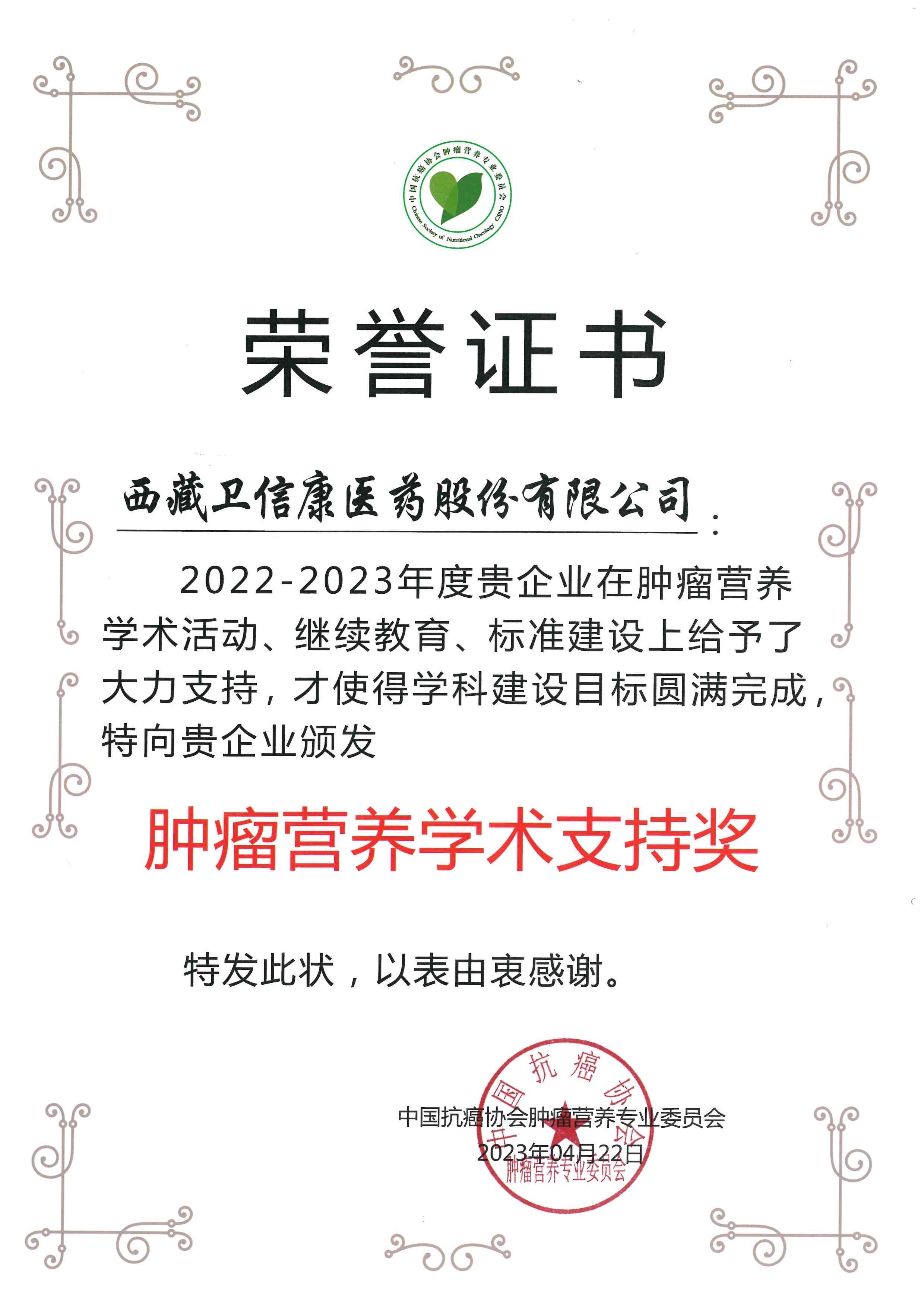大會(huì)頒獎(jiǎng)環(huán)節(jié),衛(wèi)信康醫(yī)藥再次獲得了腫瘤營養(yǎng)學(xué)術(shù)支持獎(jiǎng)這一榮譽(yù)。未來,衛(wèi)信康醫(yī)藥也將繼續(xù)砥礪前行,在營養(yǎng)治療領(lǐng)域貢獻(xiàn)自己的力量。